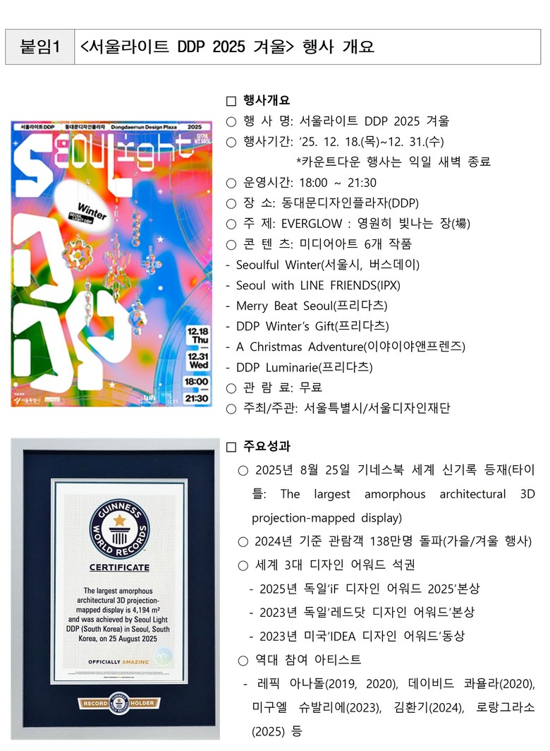 차강희 서울디자인재단 대표이사는 “‘서울라이트 DDP 겨울’은 연말연시 시민들이 빛·예술·문화를 가장 가까이에서 즐길 수 있도록 기획되었다”며 “DDP가 만들어내는 따뜻한 빛의 장면들이 시민들의 한 해를 아름답게 마무리하고, 새해의 새 출발을 환하게 비추는 특별한 경험이 되기를 바란다”고 말했다.