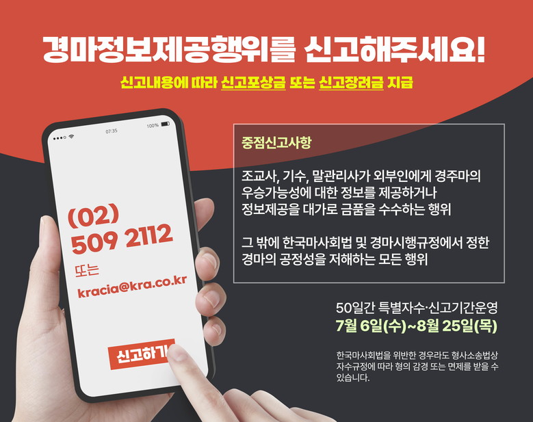 한편, 한국마사회는 경마비위 신고 활성화를 위해 특별자수기간 외에도 경마비위 신고포상금과 신고장려금 제도를 운영하고 있다. `20년 이후부터는 신고한 내용이 법 위반행위가 아니더라도 경마비위행위로 인한 상벌위원회 처분만 있으면 신고장려금이 지급될 수 있도록 제도가 개선됐다. 신고포상금 규모도 대폭 상향 되었는데, 경마관계자(조교사, 기수, 말관리사)가 신고한 경우 최대 5억 원의 포상금과 최대 5천만원의 장려금을, 일반인이 신고한 경우에는 최대 1억 원의 포상금과 최대 3천만원의 장려금을 지급받을 수 있다.