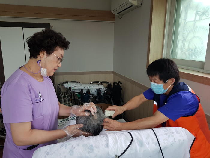 송남석 미용봉사 단장은 “코로나 19로 정기적인 미용봉사가 없어서 안타까웠는데, 오늘 미용봉사 후 깔끔해지신 어르신들의 모습에서 행복과 보람을 느낀다.”고 말했다.