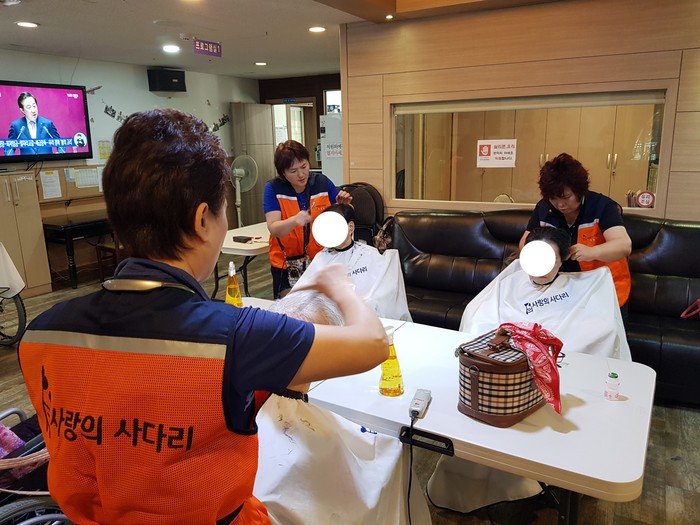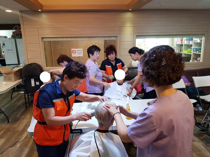 이날 미용봉사에는 박유신(머리만들기, 와동), 이미향(투투미용실, 가양동), 이순옥(이순옥 헤어샆, 오정동), 채경숙(채련화 미용실, 중리동)등 미용실을 운영하는 회원들이 생업을 잠시 미루고 미용봉사를 하였다.