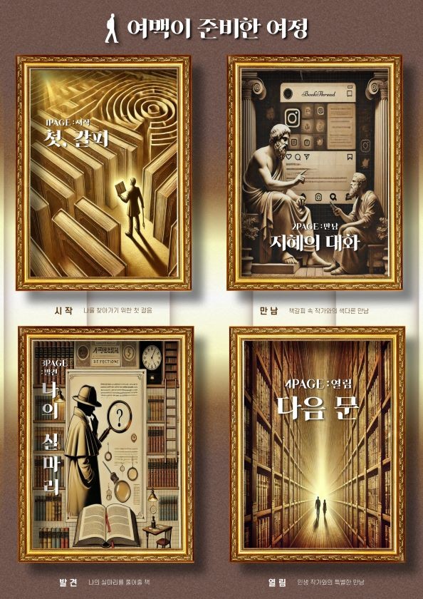 참여자는 ▲‘시작: 첫 갈피’▲‘만남: 지혜의 대화’▲‘발견: 나의 실마리’▲‘열림: 다음 문’ 네 개의 페이지로 구성된 체험형 부스를 거쳐 자신만의 이야기를 정리하며 새로운 삶의 갈피를 찾아 나선다.