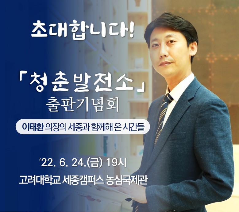 [세계타임즈=세종 이채봉 기자] 세종특별자치시의회 이태환 의장이 오는 24일 고려대학교 세종캠퍼스 농심국제관에서 지난 8년간의 의정활동을 정리하는 <청춘발전소> 출판기념회를 개최한다.