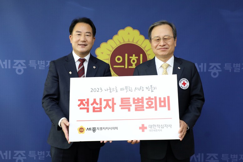 [세종 세계타임즈=이채봉 기자] 세종특별자치시의회 상병헌 의장은 9일 의장 집무실에서 대한적십자사 대전‧세종지사 송하영 회장에게 적십자 특별회비를 전달했다.