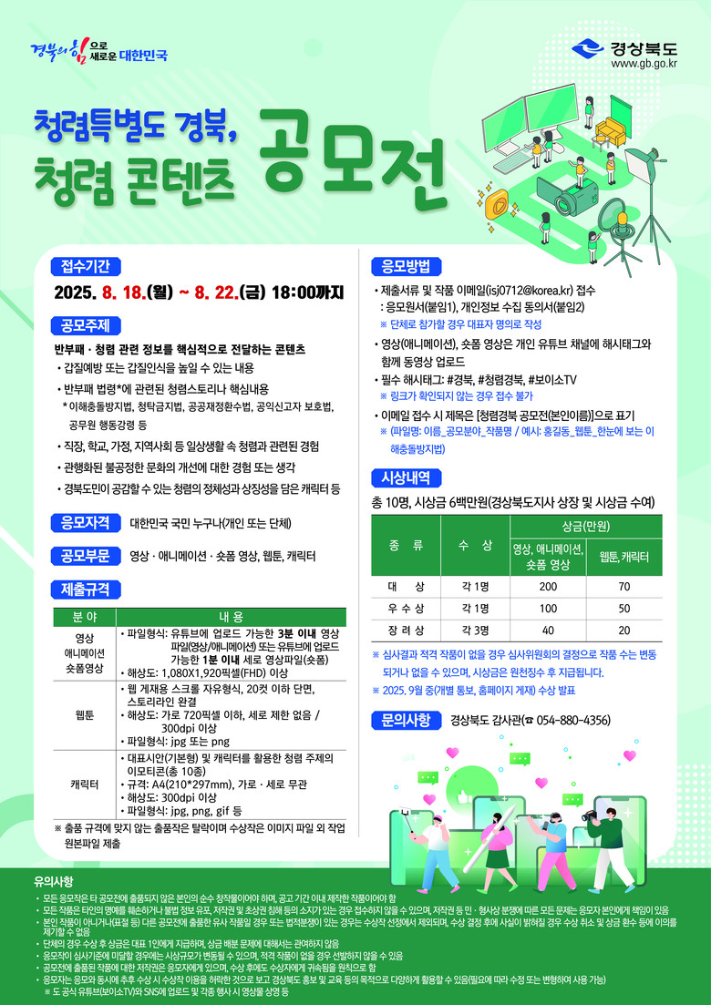 접수 기간은 8월 18일부터 22일 18시까지며, 제출 방법은 제출 서류와 콘텐츠 파일을 이메일로 접수하면 된다. 자세한 공모 내용은 경상북도 누리집 공고문을 통해 확인할 수 있다.