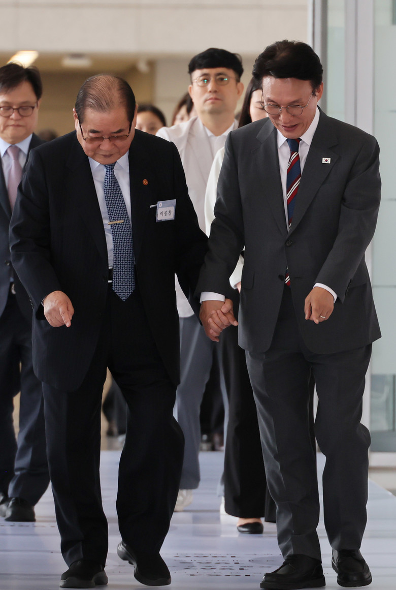 김민석 국무총리가 21일 서울 용산구 백범김구기념관에서 열린 광복 80년 기념사업추진위 출범식에서 이종찬 광복회장의 손을 잡고 이동하고 있다. 2025.7.21