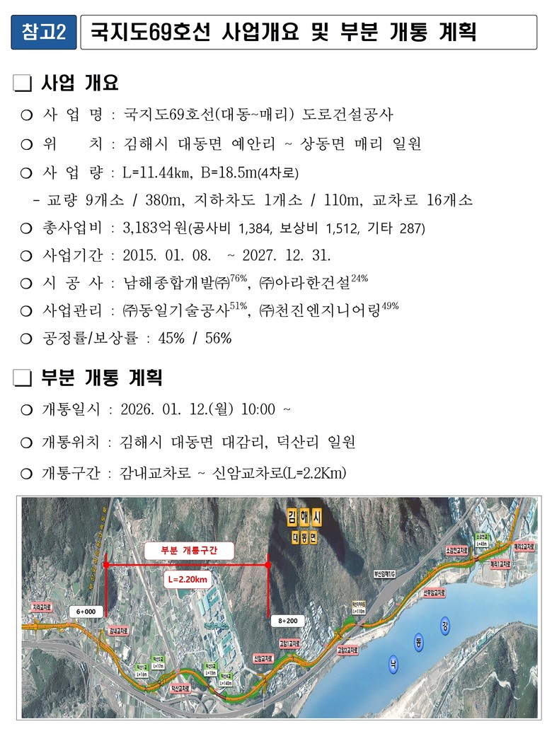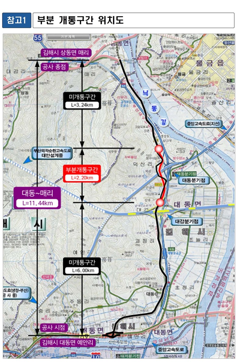 [경남 세계타임즈=최성룡 기자] 경상남도(도지사 박완수)는 오는 12일 오전 10시부터 ‘김해 대동~매리간 도로건설공사’ 구간 중 시공이 완료된 김해시 대동면 대감리 감내교차로~덕산리 신암교차로 2.2km 구간을 부분 개통한다고 밝혔다.