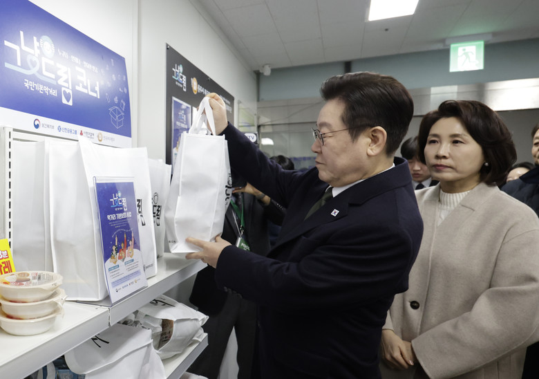 이재명 대통령과 김혜경 여사가 11일 충북 충주시건강복지타운 그냥드림 사업장을 방문해 먹거리를 살펴보고 있다.