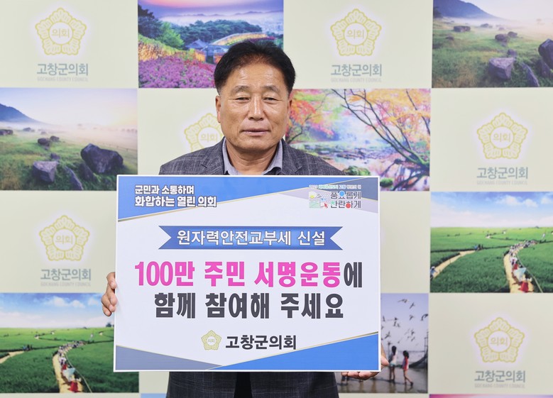 [고창군 세계타임즈 = 강옥선 기자] 임정호 고창군의회 의장은 5월 31일 원자력발전소 인근지역에‘원자력안전교부세’신설을 촉구하는‘100만 주민 서명운동’챌린지에 참여해 지방교부세법의 신속한 개정을 촉구했다.