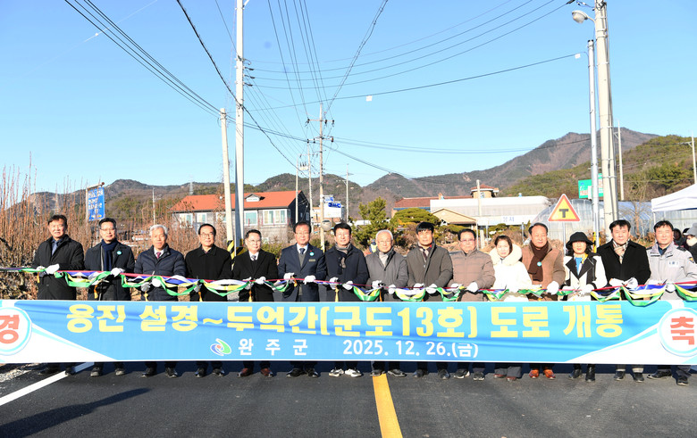 이번에 개통된 도로는 완주군 군도 13호선으로, 설경~두억 구간은 총연장 1.9km, 폭 8m의 왕복 2차선 도로다. 총사업비 67억 5,000만 원이 투입돼 2023년 4월 착공 이후 2년 8개월 만인 이달 준공됐다.