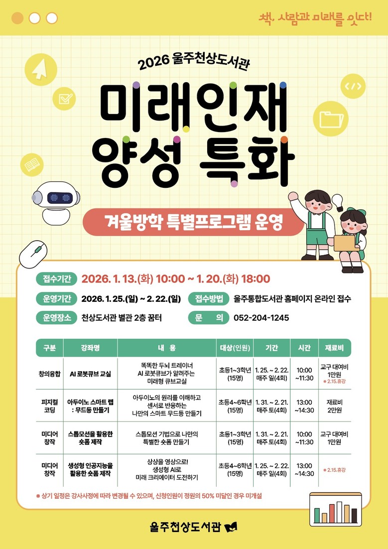 [세계타임즈=울주군 이호근 기자] 울주천상도서관이 겨울방학을 맞아 오는 25일부터 다음달 22일까지 초등학생을 대상으로 ‘미래인재 양성 특화, 겨울방학 특별프로그램’을 운영한다고 13일 밝혔다.