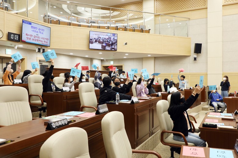학생들은 ‘학교 교육환경’을 주제로 학급을 대표하는 의견을 만들어 가는 표결 체험을 시작으로, 의회 퀴즈를 풀며 견학 체험을 마무리하였다.