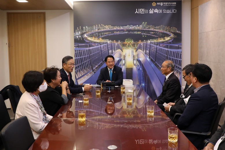 [세종 세계타임즈=이채봉 기자] 세종특별자치시의회 상병헌 의장은 11일 의회청사를 방문한 유럽한인총연합회 회장단(회장 유제헌)과 상호 협력 및 교류방안 등을 논의했다.