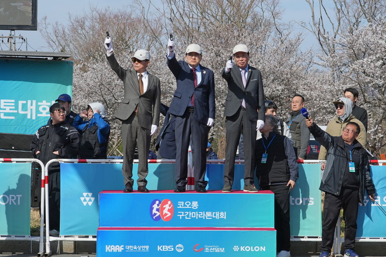 | ▲ 제41회 코오롱 구간마라톤대회 개회식에서 주낙영 경주시장(가운데)을 비롯한 관계자들이 출발 신호를 울리고 있다. (사진=경주시 제공) |
