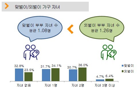 가구당 소득은 맞벌이 가정이 높았다. 맞벌이 가정은 월 765만원, 외벌이 가정은 월 529만원으로 나타났다. 가구당 자녀 수는 맞벌이 1.08명과 외벌이 1.26명으로 오히려 외벌이가 더 많은 것으로 분석됐다. 직장과 육아를 함께 해야 하는 맞벌이 가정의 육아에 대한 부담이 반영된 결과로 보인다.