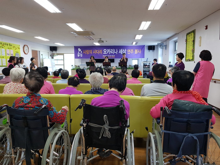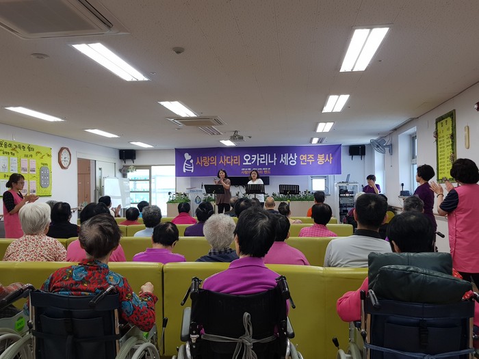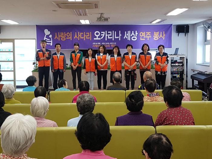 이날 오카리나 연주봉사에는 고민정 회장을 비롯해서 강은숙,김정숙,김점임,선창진,손명화,유진경,정미숙 회원들이 참석을 하였다.