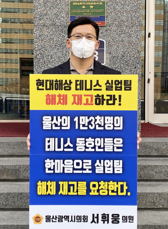 이날 1인 시위를 마치며 서 의원은 “실업팀이 없어지면 울산의 초‧중‧고 테니스 선수들이 울산을 떠나 타 시‧도로 갈 수 밖에 없다. 인구유출을 고민하고 있는 울산시로선 지속가능한 도시발전을 위해서라도 현대해상 테니스 실업팀 유지가 반드시 필요하다.”고 밝혔다.
