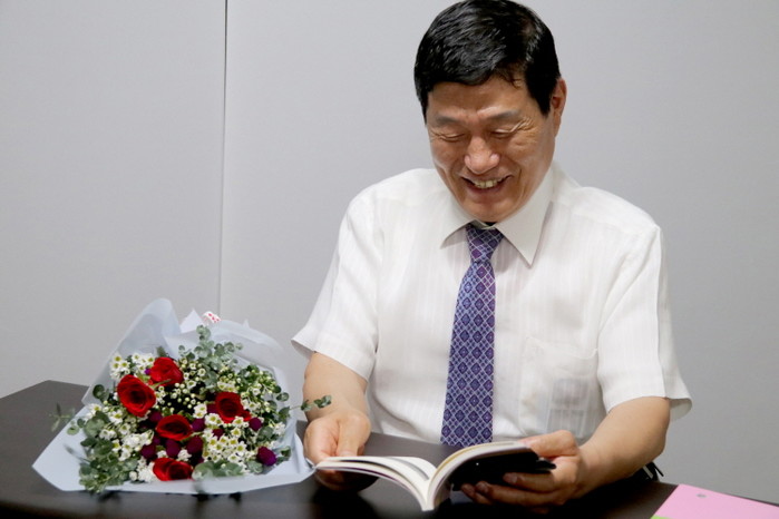 (사진=시집 한실문예창작 동인지 제15집 '시의 집을 짓다'를 들고 있는 박덕은 시인)