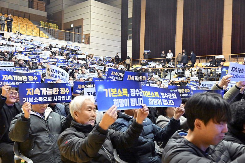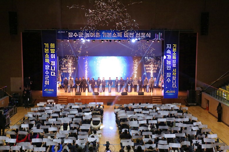 여기에 행사 참석자 전원이 ‘지속가능한 장수 기본소득으로 시작합니다’의 슬로건이 적힌 카드를 들어 올리며 환호로 화답하는 퍼포먼스가 펼쳐지며 전 군민 기본소득 시대 개막을 함께 기념했다.