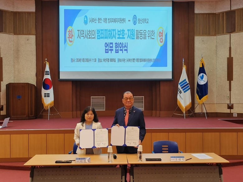 [세계타임즈]최성룡기자 = (사)마산·함안·의령 범죄피해자지원센터(이사장, 사무처장 김종식))와 창신대학교(총장 이원근)는 지난 26일 윤태석))와 『지역사회의 범죄피해자 보호 및 지원 활동을 위한 업무협약』을 체결했다고 밝혔다.