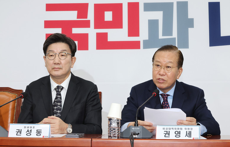 국민의힘 권영세 비상대책위원장이 13일 서울 여의도 국회에서 열린 비상대책위원 회의에서 발언하고 있다. 왼쪽은 권성동 원내대표. 2025.3.13