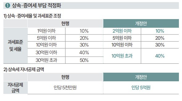 최상목 부총리 겸 기획재정부 장관은 사전 브리핑에서 이번 세법개정안은 향후 5년에 걸쳐 약 4조4천억원의 세수감소를 가져올 것이라며 올해 국세수입이 어려운 상황이지만, 2025년 이후 수출 증가에 따른 기업실적 호조, 투자촉진 등의 정책효과가 나타난다면 전반적 세수 여건이 개선될 것이라고 말했다.최대 쟁점은 상속세 개편이다.물가·자산가격 변화를 반영하고 조세체계를 합리화하는 차원에서 세율·과표 및 공제를 모두 조정하겠다는 게 세제당국 입장이다. 연말 국회를 통과해 2025년부터 과표·세율이 조정된다면, 2000년 이후 25년 만의 개편이다.현재 ▲ 1억원 이하 10% ▲ 1억~5억원 20% ▲ 5억~10억원 30% ▲ 10억~30억원 40% ▲ 30억원 초과 50%의 세율이 각각 부과된다.이를 ▲ 2억원 이하 10% ▲ 1억~5억원 20% ▲ 5억~10억원 30% ▲ 10억원 초과 40%로 조정하기로 했다. 즉, 10% 과표구간을 1억원에서 2억원으로 높이고 '30억원 초과 50%' 구간을 아예 없애겠다는 얘기다.공제에서는 자녀공제를 현행 1인당 5천만원에서 5억원으로 10배 상향하기로 했다.자녀공제(기초공제 포함)와 일괄공제 중에서 선택할 수 있는데, 자녀 6명까지는 일괄공제 5억원(자녀 0.5억x6명 및 기초공제 2억원)을 넘지 못하기 때문에 사실상 자녀공제의 실효성이 없는 현실을 고려한 것이다.배우자공제 5억~30억원(법정 상속지분 한도), 일괄공제 5억원은 현행대로 유지된다.가령, 상속재산 25억원에 배우자 1명·자녀 2명이라면 기존에는 배우자공제와 별도로 일괄공제 5억원만 받았지만, 앞으로는 자녀공제 10억원 및 기초공제 2억원까지 12억원 공제를 선택할 수 있다.이렇게 되면 공제액이 7억원 증가하고 상속세는 2억7천만원(배우자공제 5억원 기준) 줄어든다고 기재부는 설명했다.