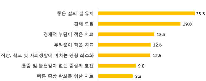 환자들이 염증성장질환 치료/관리에서 가장 기대하는 것은 ‘좋은 삶의 질’ 유지(23.3%)인 것으로 나타났다. 이어 관해 도달이 19.8%, 경제적 부담이 적은 치료 13.5%, 부작용이 적은 치료가 12.6% 순이었다.