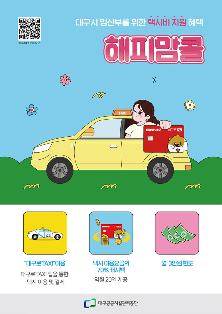 ‘해피맘콜’은 공단이 복권기금을 활용해 운영하는 교통복지 서비스로, 대구시에 거주하는 임산부에게 매월 3만 원의 택시요금을 지원해 안전하고 편리한 이동을 돕고, 출산 친화 도시 조성에도 기여하고 있다.