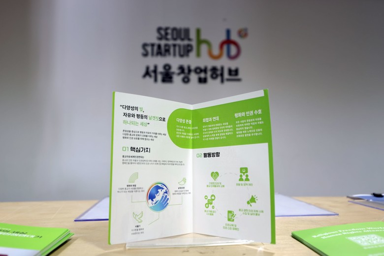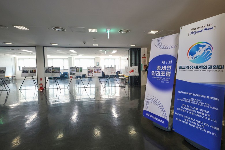 종교자유세계인권연대(종세연)가 22일 서울창업허브 공덕에서 제1회 정기총회 및 인권포럼을 연 가운데, 행사장에서 사진전이 열린 모습
