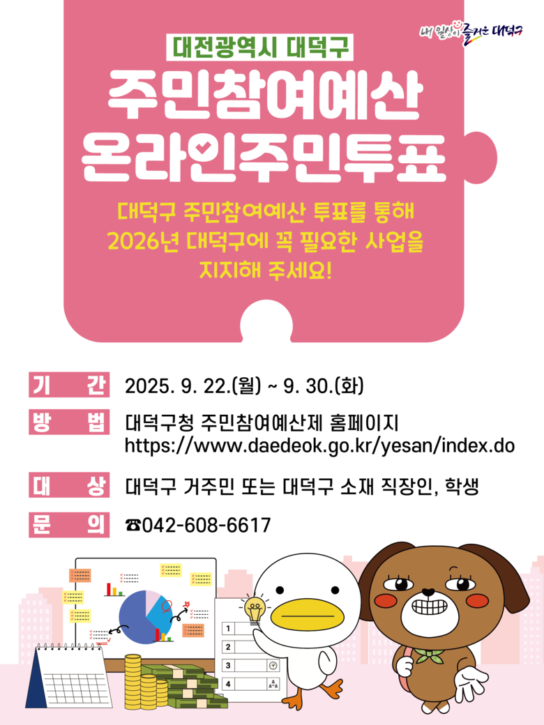 대덕구 거주민은 물론 대덕구 소재 직장인·학생 모두 투표에 참여할 수 있으며, 대덕구 주민참여예산제 홈페이지에 로그인해 본인인증을 마친 뒤, 관심 사업 최대 3개를 선택해 투표하면 된다.