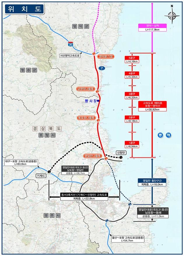 한편, 이번 포항~영덕 고속도로의 개통으로 국가간선도로망 남북10축(부산~포항~고성, 433㎞) 중 미연결 구간은 영일만 횡단(18㎞), 영덕~삼척(117.9㎞), 속초~고성(43.5㎞)만 남았다.