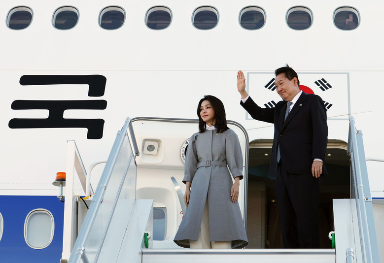 윤석열 대통령과 김건희 여사가 영국ㆍ미국ㆍ캐나다 순방을 마치고 23일(현지시간) 캐나다 오타와 국제공항에서 공군 1호기에 올라 환송인사들에게 손을 들어 인사하고 있다.[사진=연합뉴스]