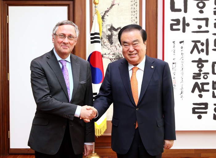 [세계타임즈 이채봉 기자]문희상 국회의장은 11월 20일(화) 오전 의장 집무실에서 피터 레스쿠이에(Peter LESCOUHIER) 주한 벨기에 대사의 예방을 받았다.