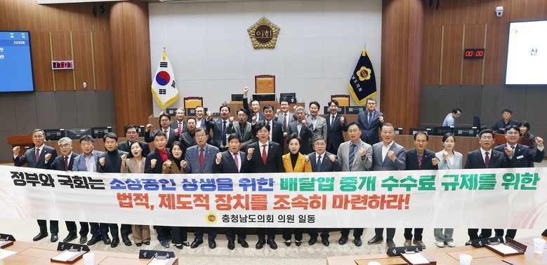 특히 이 의원은 “배달앱 수수료 상한제 도입을 통해 소상공인들이 안정적으로 경영할 수 있는 환경을 조성해야 한다”며 “충남도민과 도의회의 목소리를 대변해 배달앱 수수료 규제를 통한 소상공인 부담 완화, 배달기사의 안정적인 수입 보장, 국민 부담 완화를 위한 종합적인 정책 마련을 정부와 국회에 강력히 요구한다”고 촉구했다.