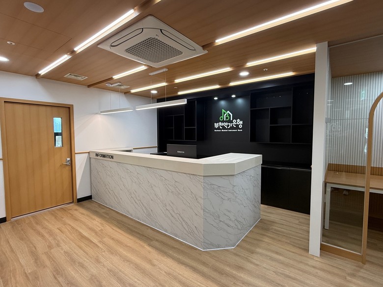 ‘부천 악기은행’은 약 400대를 보관할 수 있는 악기보관실과 악기 상태 점검이 가능한 교습실을 갖췄다. 또한 이용 편의를 위해 접수 데스크를 설치하고 내부 마감재를 개선해 쾌적하고 안정적인 환경을 조성했다.