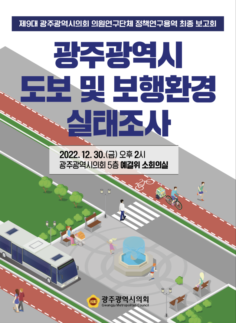 이번 실태조사는 광주광역시의회가 보도의 공적 효용성에 대한 관심 증대와 기후위기에 대응하는 ‘걸어 다닐 수 있는 도시’(walkable city) 환경 조성을 위한 정책 개발을 목적으로 추진했다.