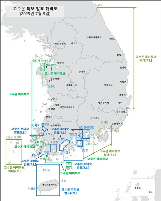 고수온 주의보는 수온이 28℃ 도달하거나 도달할 것으로 예측되는 해역에 발표되며, 올해 도내 해역 고수온 주의보 발표는 장마 조기종료, 폭염 지속으로 작년보다 24일 정도 앞당겨졌다.