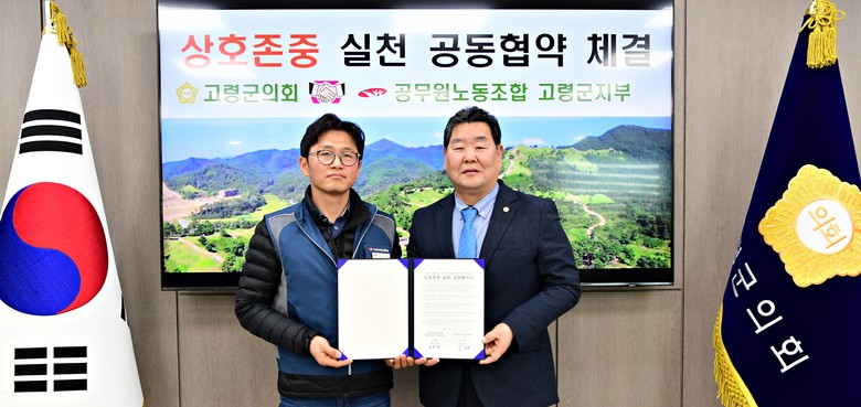 의장실에서 진행된 체결식은 김명국 의장을 포함한 군의원 전원과 공무원노동조합 고령군지부 회장단 9명이 참석한 가운데, 상호존중 실천 공동협약 체결, 미래 군정발전 방안 논의 순으로 진행되었다.