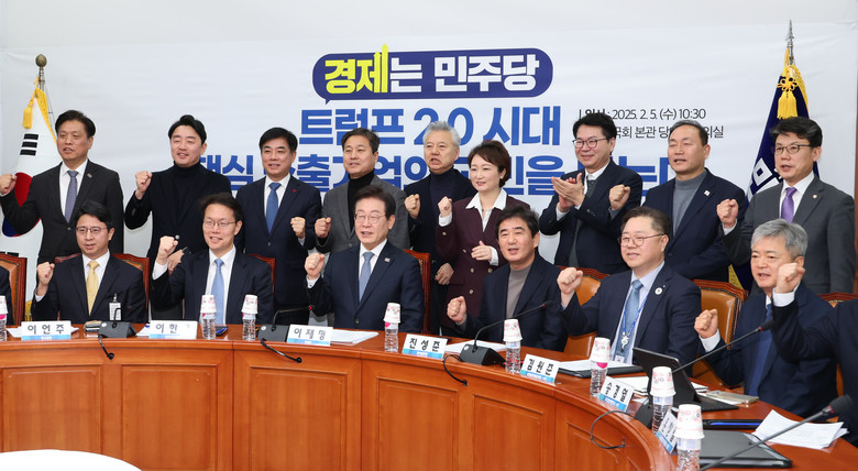 더불어민주당 이재명 대표가 5일 서울 여의도 국회에서 "트럼프 2.0 시대 핵심 수출기업의 고민을 듣는다"란 주제로 열린 토론회에서 기념촬영 하고 있다. 2025.2.5
