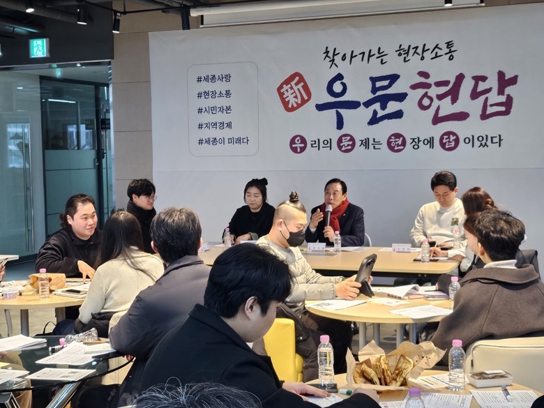 최민호 시장은 25일 조치원읍에서 찾아가는 현장소통 ‘우문현답’의 첫 번째 시작을 청년창업가들과 함께했다.