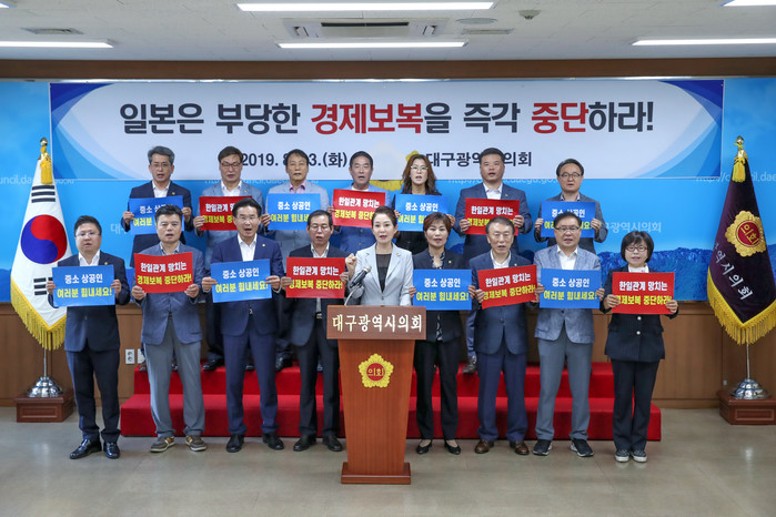 대구시의원들은 일본 정부의 수출규제 등 경제 도발행위 철회 촉구 성명 발표하면서 ‘한일관계 망치는 경제보복 중단하라!’, ‘중소 상공인 여러분 힘내세요’라는 문구가 적힌 카드를 들고 아베정권 규탄과 함께, 이로 인해 어려움을 겪고 있는 지역의 중소 상공인들을 위한 응원메시지도 함께 전하는 퍼포먼스를 펼치기도 했다.