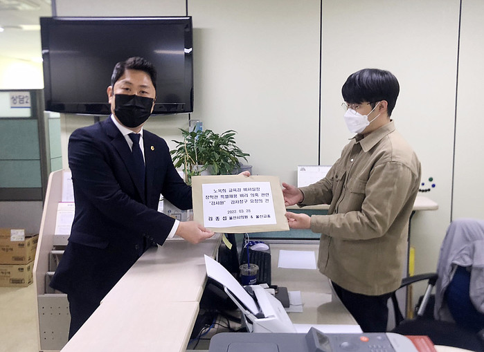 [울산=세계타임즈 이호근 기자] 울산광역시의회 교육위원회 김종섭 의원은 지난해 행정사무감사에서 언급한 노옥희 교육감 비서실장의 장학관 특별채용 비리 의혹과 관련하여, 28일 오후1시 1,750명의 서명을 받은 감사청구서를 감사원 부산출장소에 제출하였다.
