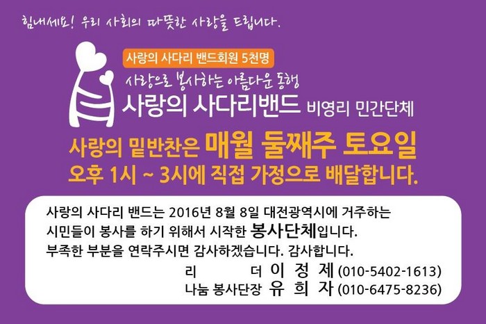 사랑의 사다리 밴드의 밑반찬 봉사는 대전시에 거주하는 장애인 126명, 독거노인 81명, 저소득층 및 다문화 23명 등 230명의 가정에 매월 둘째 주 토요일에 밴드 회원들의 십시일반 후원으로 밑반찬 봉사를 하고 있다.