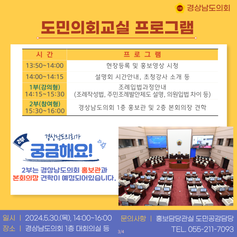 [경남 세계타임즈=최성룡 기자] 경상남도의회(의장 김진부)는 도민의 지방자치 참여강화를 위해 2024년 5월 30일(오후 2시) “도민의회교실”을 개최한다.