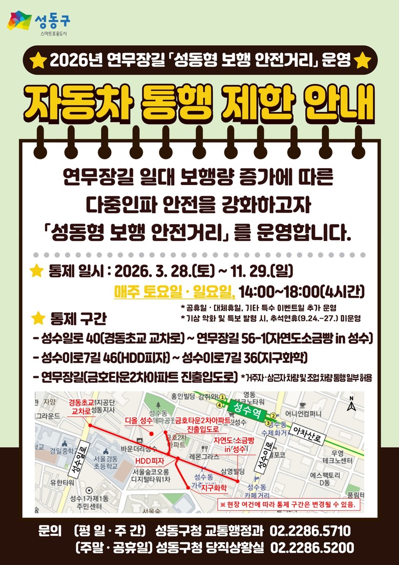 - 주말 다중 운집 및 교통사고 위험 대응, 거주자·상근자·조업 차량 통행 일부 허용으로 지역 불편 최소화 [성동구 세계타임즈=이장성 기자] 서울 성동구는 성수동 연무장길 일대의 교통사고 위험과 다중 운집에 효과적으로 대응하기 위해 오는 3월 28일부터 11월 29일까지 매주 토요일과 일요일 오후 2시부터 6시까지 ‘성동형 보행 안전거리’를 운영한다고 밝혔다.