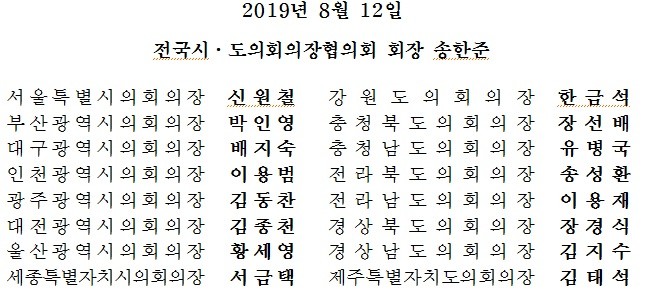 이에 전국 17개 시·도의회 의장들은 국민들이 자발적으로 펼치고 있는 불매운동 등의 각종 활동을 지지하며 국민들과 함께 승리를 쟁취할 것임을 분명히 밝힌다. 또한 피해를 입은 기업들에 대한 지원과 함께 이번 경제침략에 대한 승리만이 아닌 동북아 지역의 평화와 공존을 위한 초석을 만들어 나아갈 것이다.
