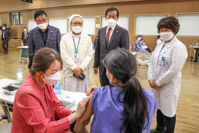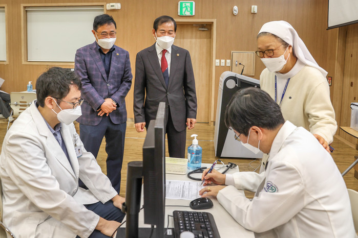이날 대구시의회 장상수 의장과 김재우 의원(문화복지위원장, 동구1)은 지난 3월 4일부터 시작된 고위험 의료기관 종사자에 대한 아스트라제네카 백신 접종이 한창인 파티마 병원을 찾아, 병원 대외협력실장의 현장 설명을 들은 뒤, 김선미 병원장과 함께 접종 현장을 둘러보며 현장의 어려움을 듣고 공감하면서 개선방향을 함께 고민하는 시간을 가졌다.
