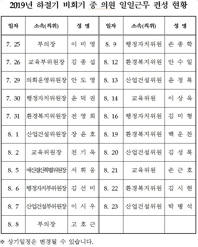 한편, 시의회는 지난 2005년부터 매년, 동절기 및 하절기 비회기 기간 중 의원 일일 근무를 실시하여 시민 및 전문가들과의 간담회 등을 개최하여 민원을 해결하고, 집행부와 긴밀한 협조체제를 유지하는 등 공백없는 의정활동을 해오고 있다.