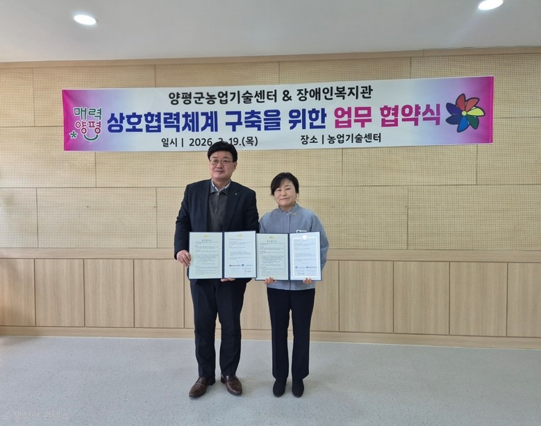 [양평군 세계타임즈=송민수 기자] 양평군(군수 전진선)은 지난 19일 농업기술센터 소장실에서 장애인복지관과 지역사회 장애인의 삶의 질 향상과 복지 증진을 위한 업무협약(MOU)을 체결했다고 밝혔다.