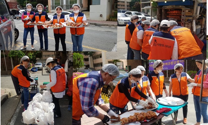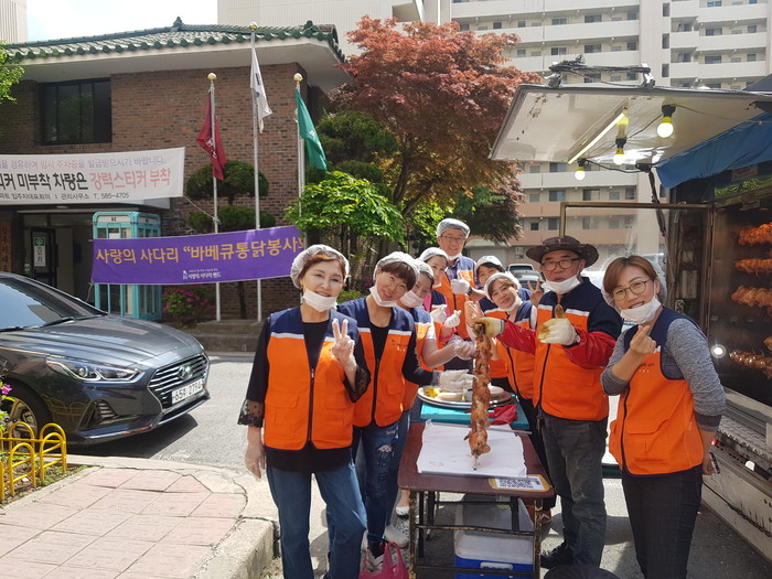 현장에서 직접구운 통닭은 우성아파트 경로당, 원대경로당과 산성동 저소득층 30가정에 전달이 되었다.