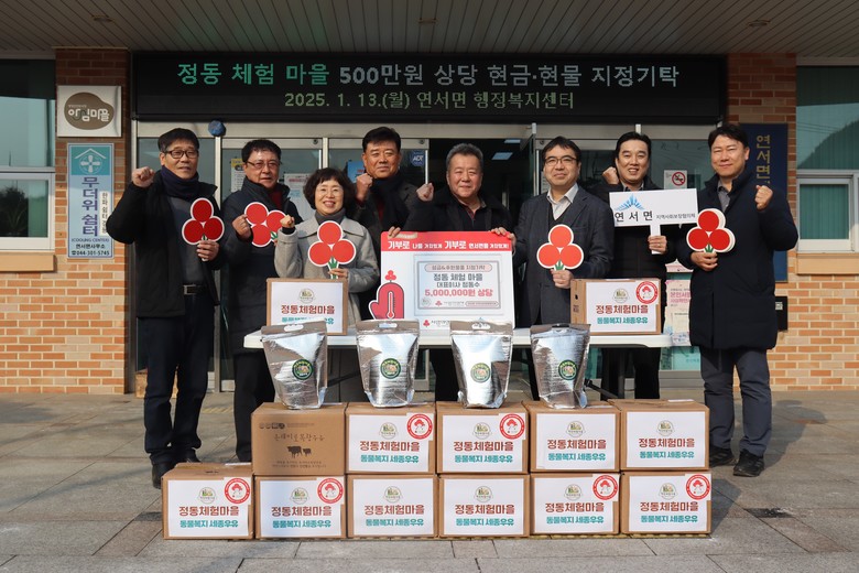 [세종 세계타임즈=이채봉 기자] 세종시 연서면에 위치한 정동체험마을(대표이사 정동수)이 13일 연서면 지역사회보장협의체(공동위원장 김학용·한재현)에 500만 원 상당의 현금·현물을 기탁했다.